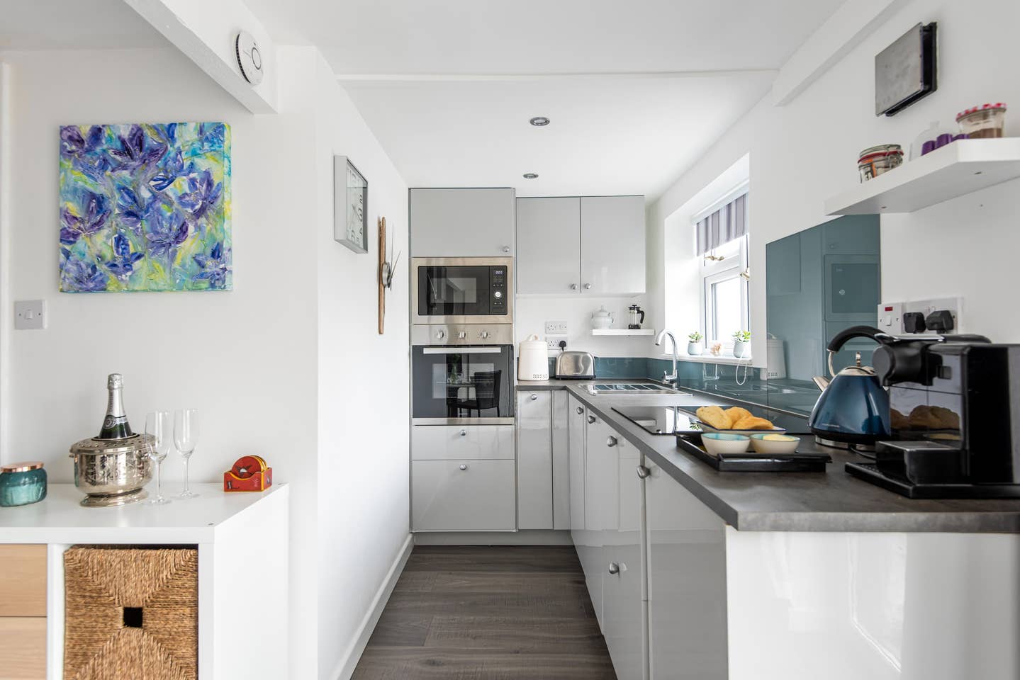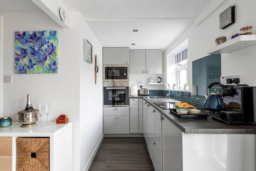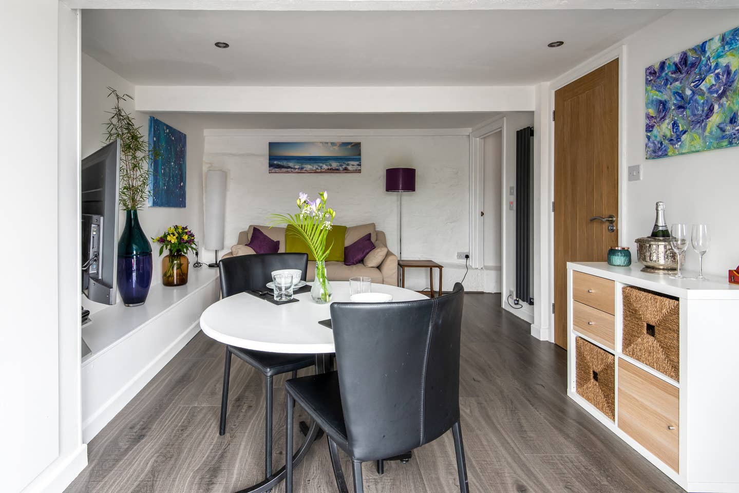 The kitchen is equipped with cooker, microwave, induction hob, Nespresso coffee maker and dishwasher. The open plan lounge, kitchen and dining area is a comfortable space for two with the sofa bed enabling the occasional extra guest. A travel cot and high chair are also available.