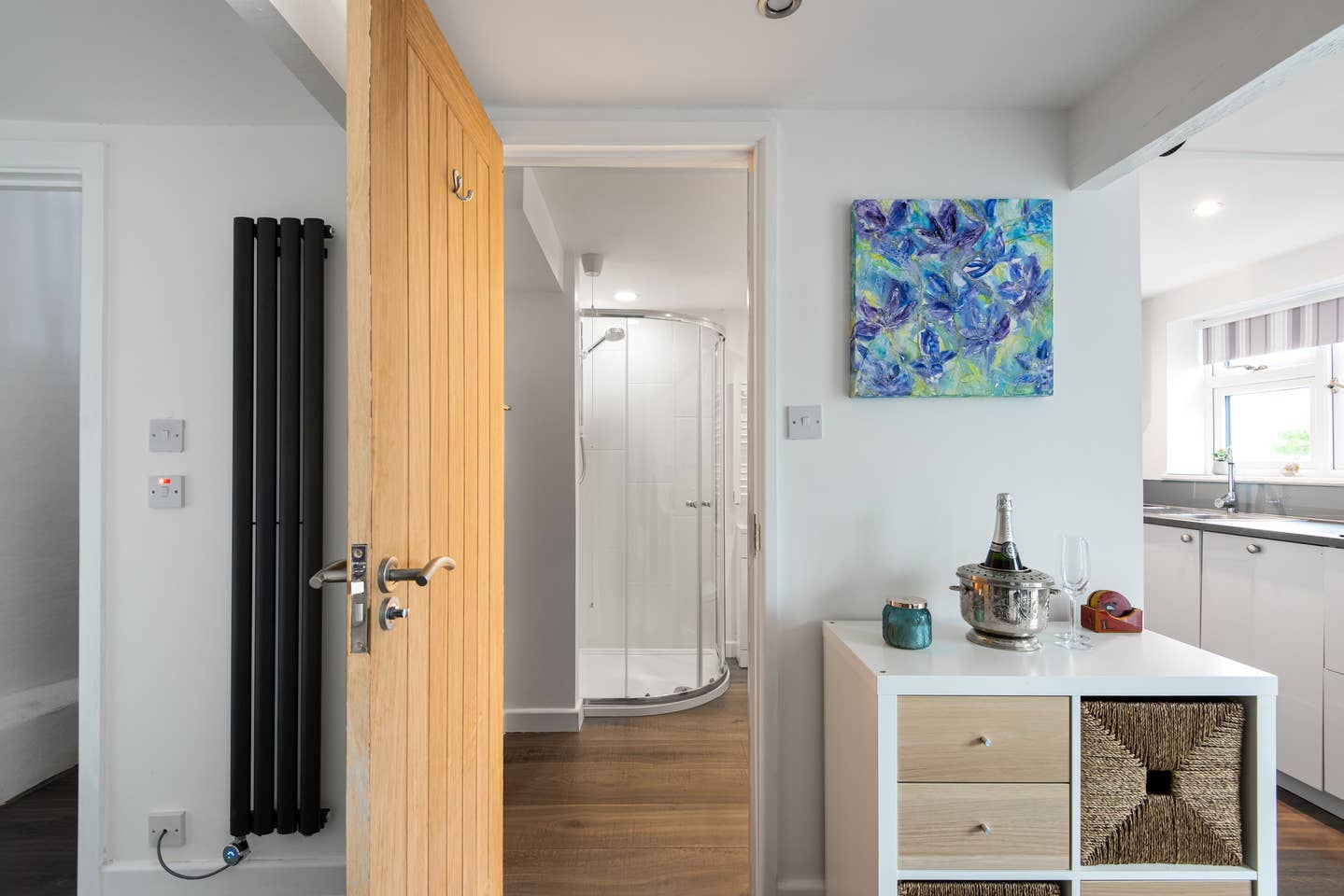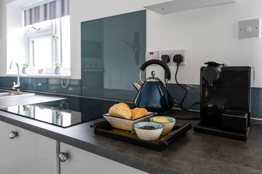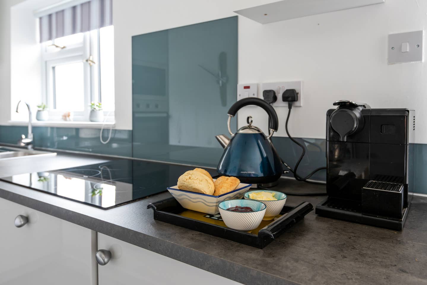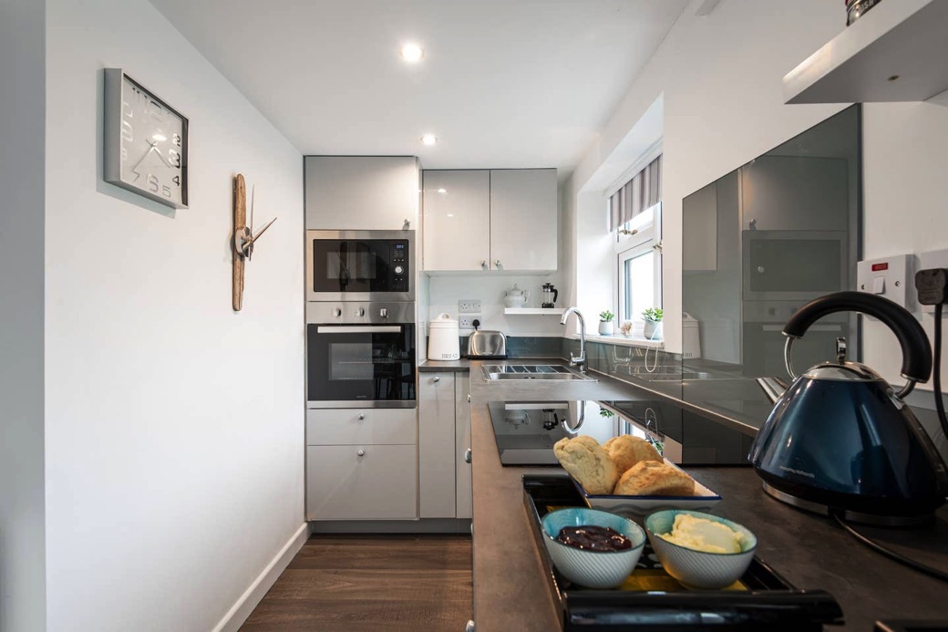The kitchen is equipped with cooker, microwave, induction hob, Nespresso coffee maker and dishwasher. The open plan lounge, kitchen and dining area is a comfortable space for two with the sofa bed enabling the occasional extra guest. A travel cot and high chair are also available.